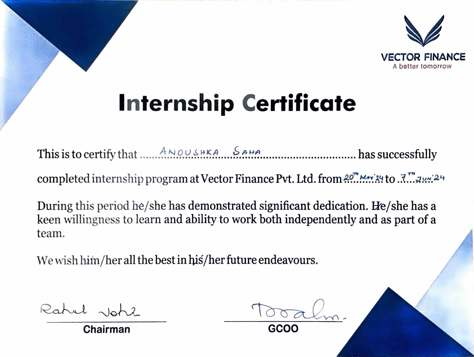 - I did an internship with Vector Finance Pvt Ltd. and CC Saha Ltd.