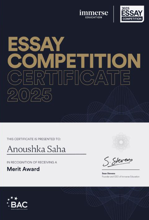 - The Immerse Essay Competition is an extremely prestigious international contest in which one has to write an essay on a topic from the subject of their interest. I got ‘Special Mention’ Award which meant that I was in the top 250 out of 6000+ entries across the world.